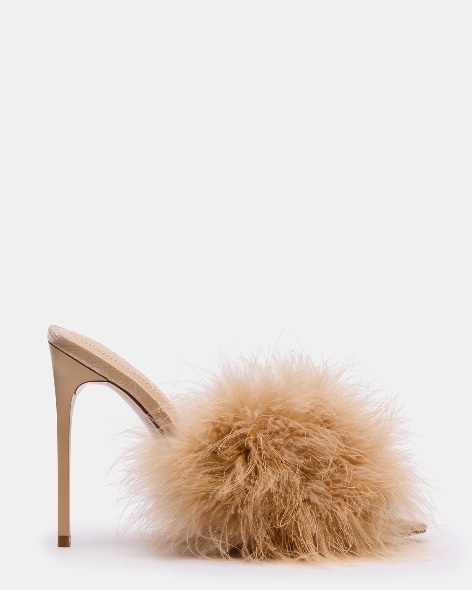 Elevate your style with the ASHBEY mule. featuring a sleek pointed-toe silhouette and a slender stiletto heel for a refined profile. Adorned with delicate feathers. this design adds a touch of sophisticated flair. perfect for making a statement at any event. The slip-on mule construction ensures effortless wear while maintaining an elegant. fashion-forward look.