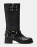 The ASTOR square toe boot features a slouchy mid-calf silhouette reinforced with strap accents and substantial buckle hardware. A wide sole with a block heel provides a solid foundation for this engineer-inspired design.