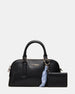 The CALLY BAG BLACK is a refined dome satchel designed for versatility and style. Featuring a structured top handle. this bag includes an attachable printed scarf. adding a personalized touch of sophistication. It also comes with an attachable card case and crossbody strap. providing convenient organization without compromising elegance. Ideal for both everyday use and special occasions. this satchel combines practical functionality with polished aesthetics.
