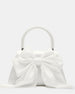 Introducing the sophisticated COSETTE bag. Expertly crafted with smooth satin and a beaded top handle. this elegant bag features a long satin bow and a structured top handle for a touch of glamour. The interior back slit pocket and detachable chain strap add practicality to its angled. trapezoid silhouette. Perfect for any formal occasion. this bag is a must-have for the style-conscious individual.