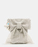 The IZZIEE bag is a stylish and versatile bow-shaped crossbody bag. It features all-over rhinestone embellishments and a multi-colored beaded shoulder strap. The attachable heart bag charm adds a playful element to the bag. The interior pouch on the back wall provides extra storage and organization for your belongings. Elevate any outfit with this eye-catching and functional bag.