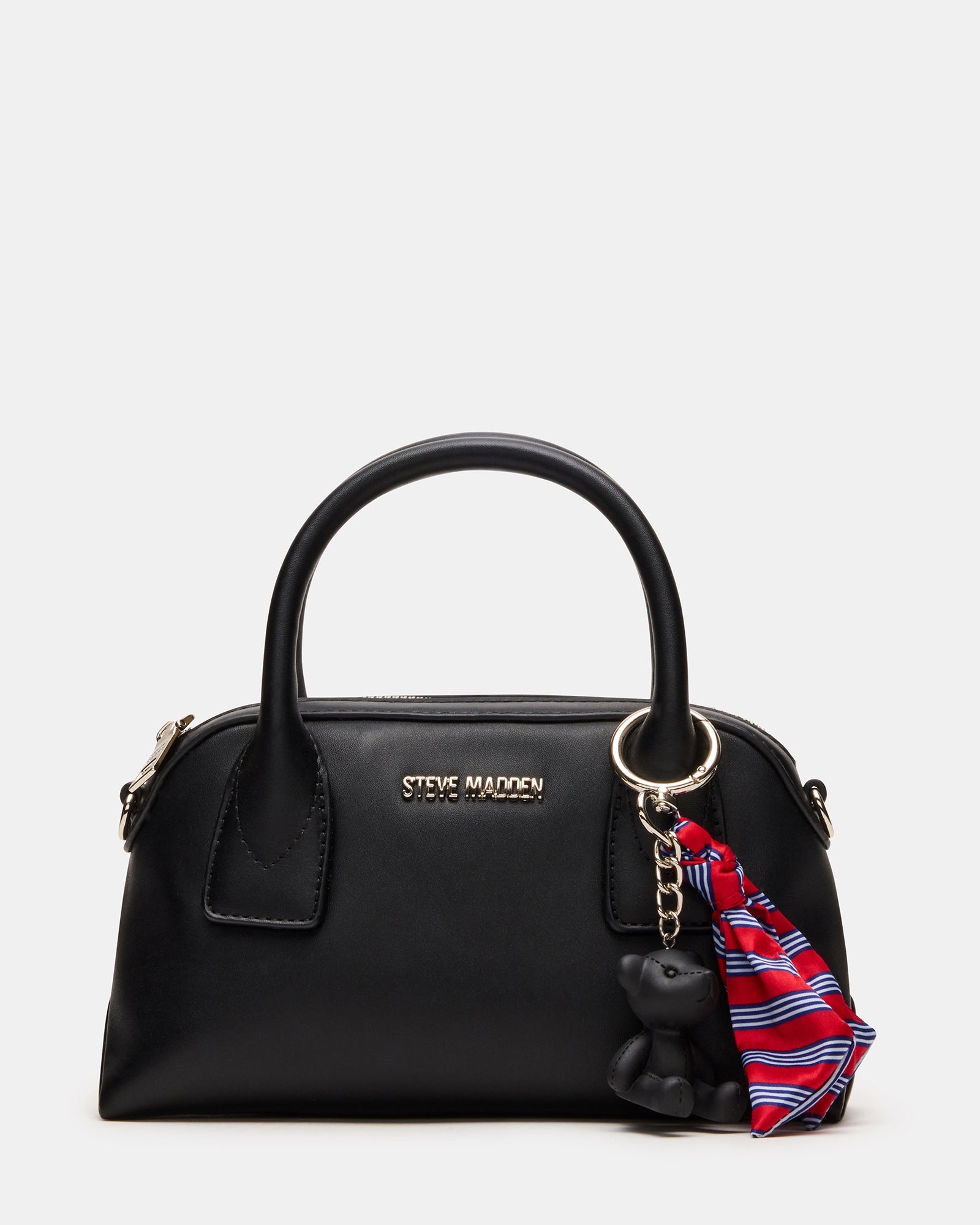 The MELODIE BAG BLACK features a versatile top handle paired with an attachable crossbody strap for adaptable wear. Enhanced with a charming attachable bear bag charm and a colorful scarf. it adds a sophisticated touch to your ensemble. Secure your essentials with the zipper closure. while the interior pouch on the back wall offers organized storage for smaller items. This bag blends stylish accents with practical design. perfect for refined. everyday use.