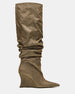 The DISTORTION GOLD GLITTER boot features a scrunched design. wedge heel. and a pointed-toe. extending to knee height for a bold. fashion-forward silhouette. Crafted to combine edgy style with comfortable wear. this boot elevates any outfit with its sleek design and distinctive wedge support. Ideal for those seeking a statement piece that balances trend and practicality.