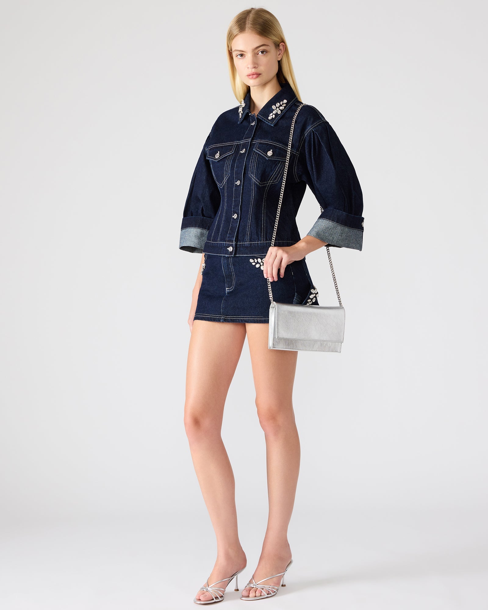Expertly crafted and versatile. the JULIANA BAG SILVER is a wardrobe staple. The clutch design offers convenience and style. with a magnetic snap closure and removable crossbody chain strap. Its interior back wall slip pocket holds credit cards and valuables. making it perfect for any occasion.