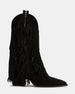 The LANDMARK BLACK SUEDE bootie showcases expert craftsmanship with a bold western influence. Featuring stylish fringe accents. stud detailing. and a cuffed silhouette. these booties offer a distinctive look. The pointed toe enhances their sleek profile. making them an ideal choice for those seeking a versatile blend of character and sophistication.