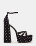 The RETRO WHITE/BLACK POLKA DOT showcases a classic platform design paired with a block heel for enhanced balance and comfort. Its open toe offers breathability and style. while the adjustable ankle strap ensures a secure fit. This combination delivers both elevated height and lasting support. making it the perfect heel for those seeking a refined look.