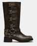 The ROCKY BROWN DISTRESSED WIDE CALF knee boot features the wide profile of an engineer boot with harness and buckle hardware adding an industrial edge and giving the design an adjustable fit.