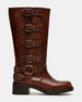 The ROCKY COGNAC DISTRESSED WIDE CALF knee boot features the wide profile of an engineer boot with harness and buckle hardware adding an industrial edge and giving the design an adjustable fit.